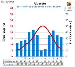 La provincia de Albacete está situada en la Comunidad Autónoma de Castilla-La Mancha. El climograma de arriba representa los datos de temperaturas medias mensuales y precipitaciones medias en Albacete ciudad.