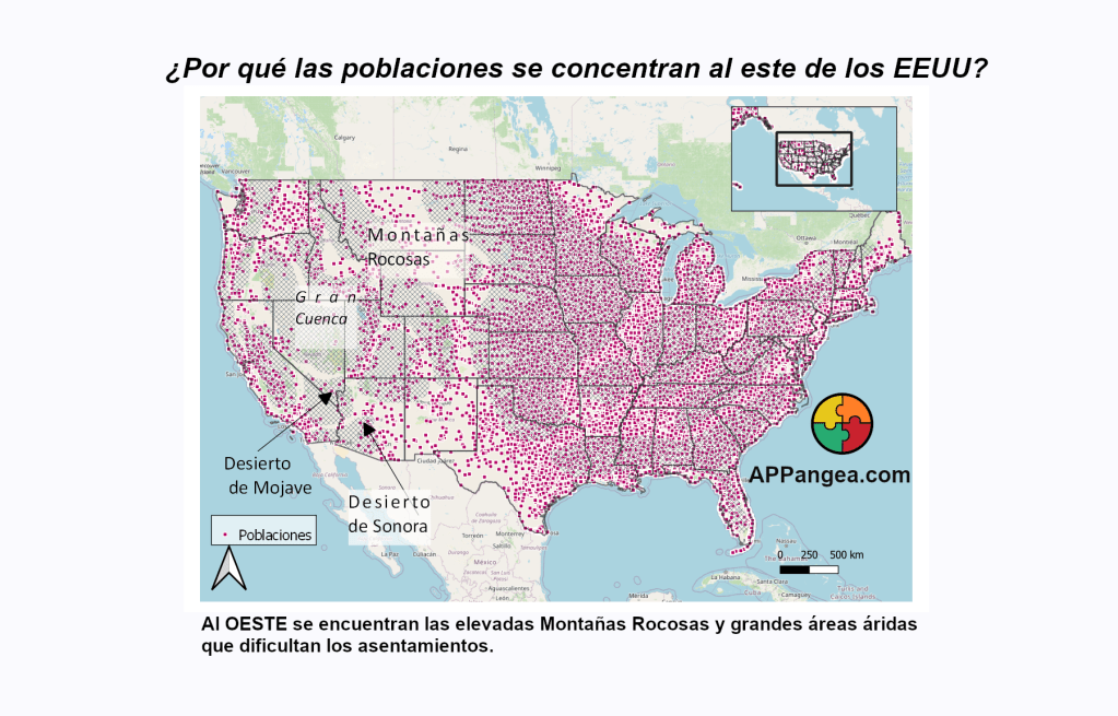 #Curiosidades APPangea: distribución geográfica de las poblaciones de los EEUU. Un ejemplo de cómo la #Geografía condiciona los asentamientos humanos.