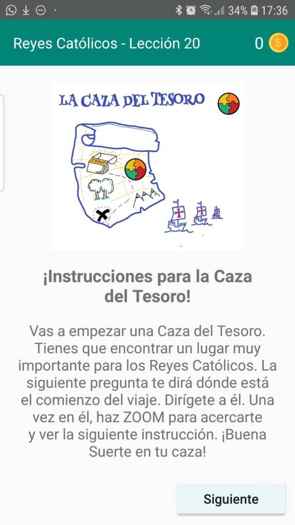 - Caza del tesoro: se incluye una “caza” en la que el alumno aplica los conocimientos adquiridos en la unidad para ir visitando lugares del mapa hasta llegar al indicado. Todo un entretenimiento para el alumno y una prueba del conocimiento adquirido para el profesor.