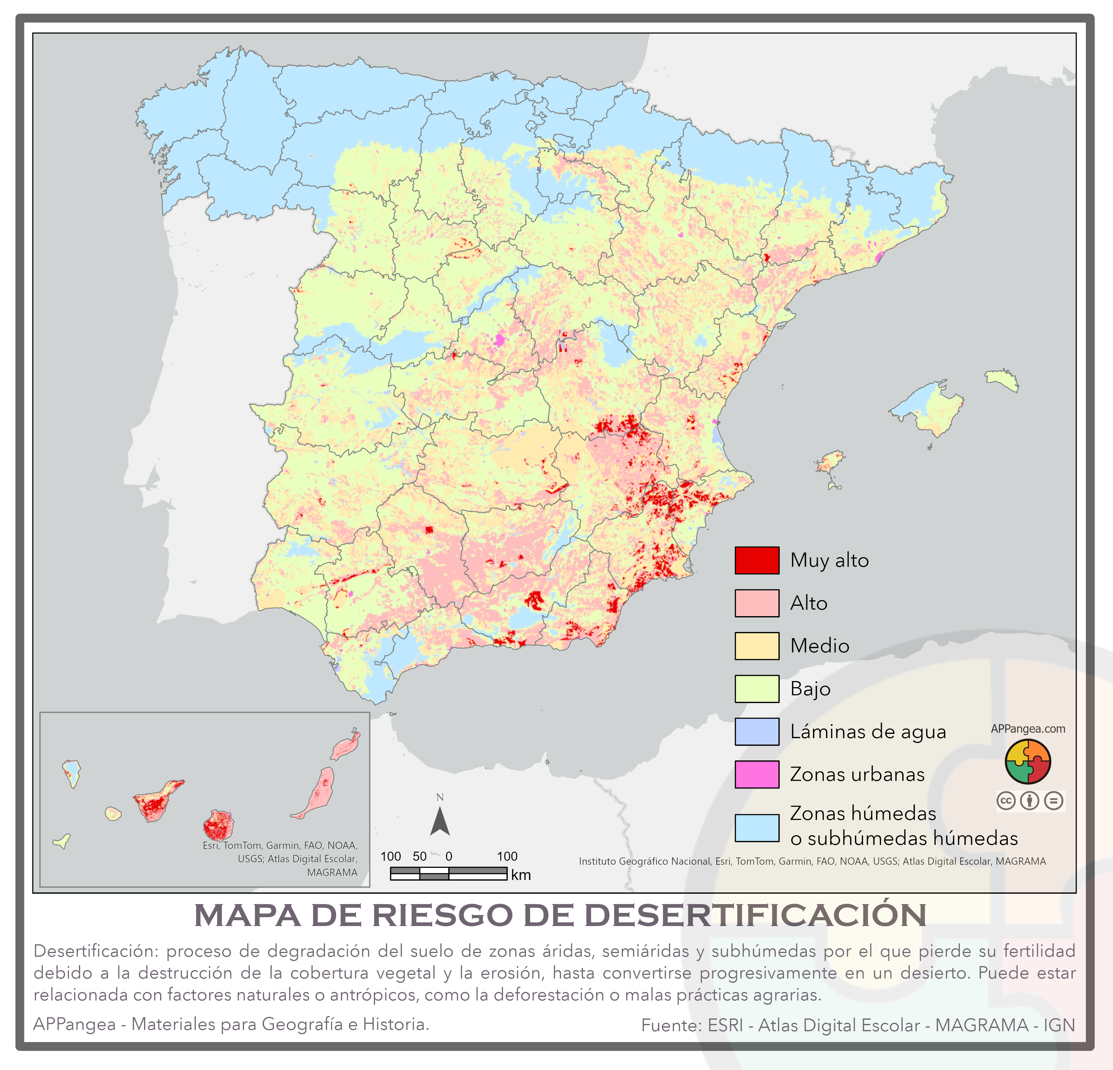 El Mapa de Riesgo de Desertificación de España muestra las zonas del país con mayor vulnerabilidad a la degradación del suelo y la pérdida de fertilidad. Se basa en criterios como la erosión, los incendios forestales, la sobreexplotación de acuíferos y la aridez, asignando niveles de riesgo muy alto, alto, medio o bajo.