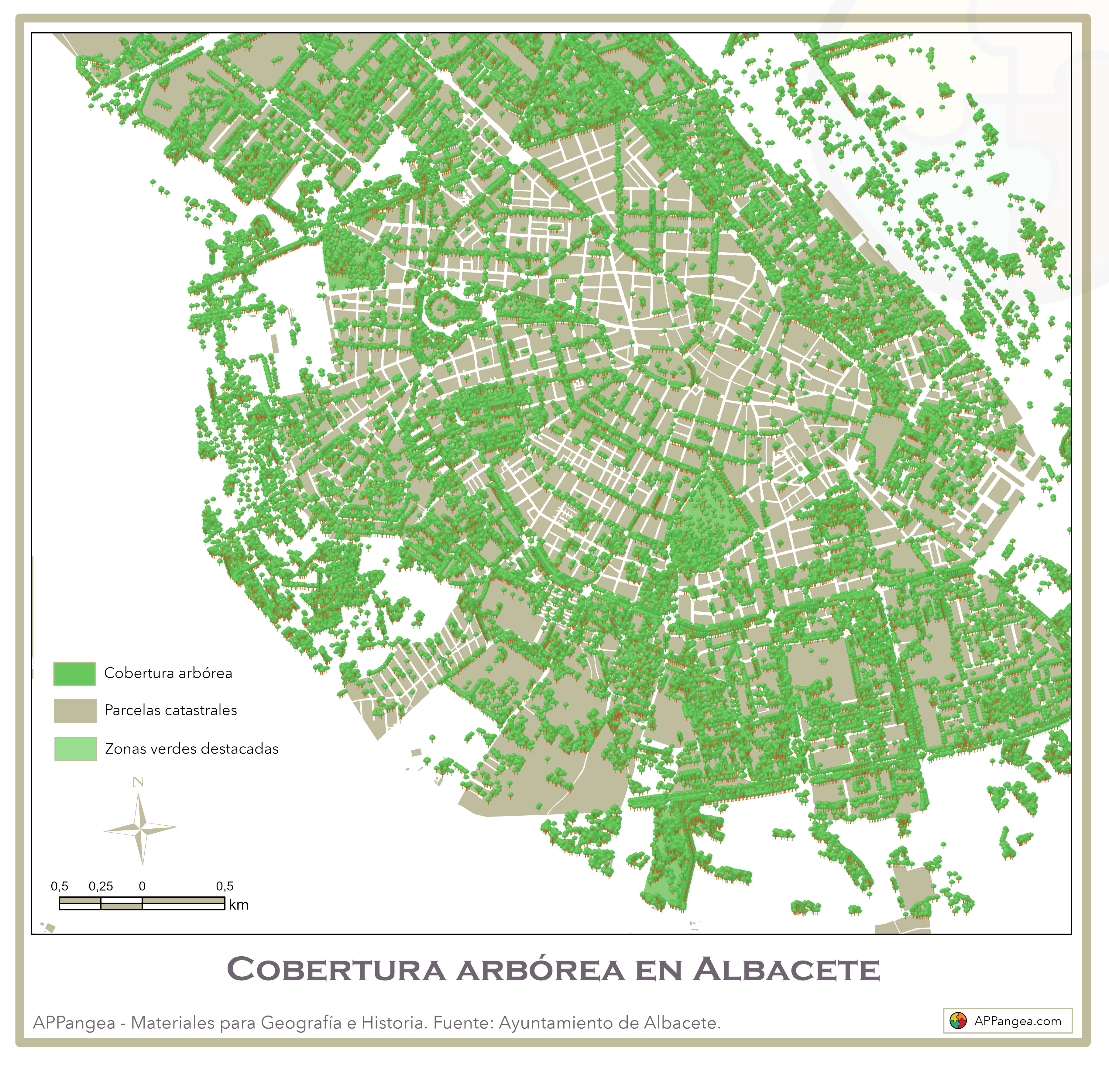 Geografía de Albacete. Cobertura arbórea de Albacete ciudad.[Mapa y Comentario]