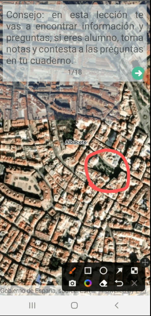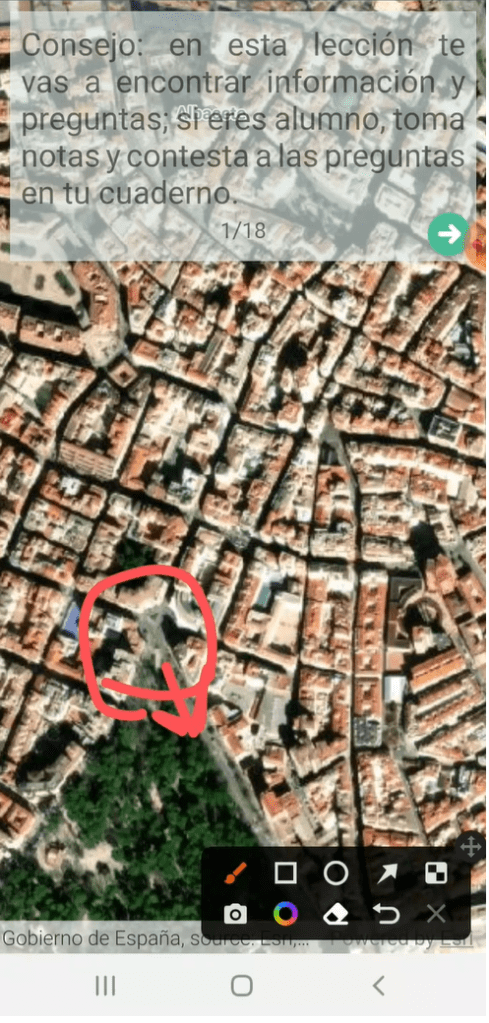 A continuación se muestra una captura de pantalla de un vídeo realizado en el que un alumno explicaba sobre el modo Descubre de Provincias de España aspectos de geografía urbana de su barrio. Los puntos de interés los señalaba en rojo dibujando durante la captura de vídeo.