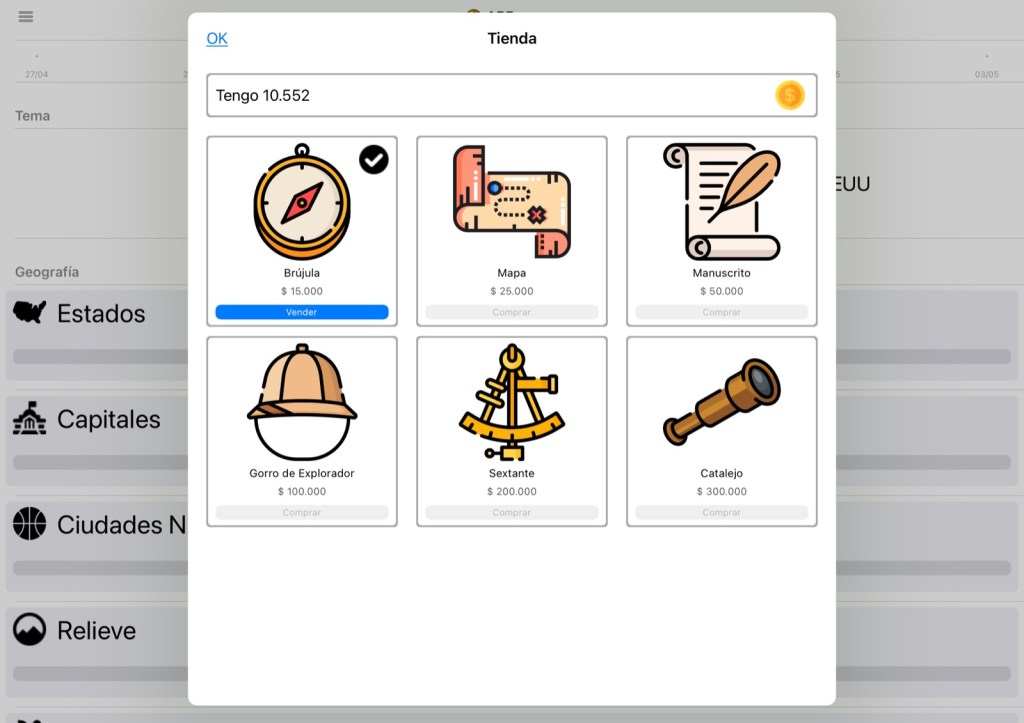 - Ir a la Tienda para canjear los puntos por objetos. Si compran un objeto luego lo pueden devolver (con una pequeña penalización), para facilitar al alumnado y al docente la posibilidad de plantear retos.