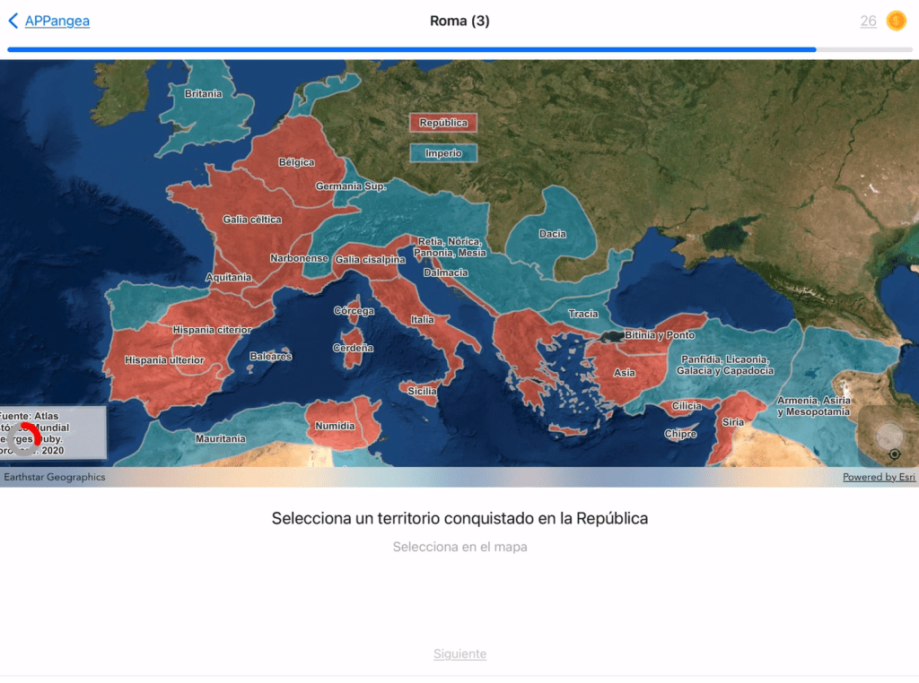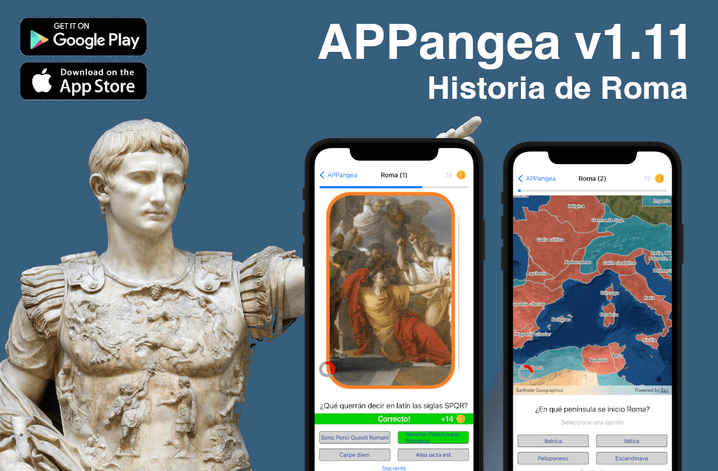 Localización. El juego de Historia de Roma tiene varias preguntas sobre dónde ocurrieron los hechos más destacados de Roma. Los hechos sobre los que pregunta se pueden consultar en el modo Descubre antes de empezar el juego. Son hechos muy conocidos de la Historia de Roma y es necesario que los alumnos de Primaria y Secundaria no solo los conozcan, sino que también sepan dónde ocurrieron, localizándolos en una mapa. Ese es el estilo APPangea.