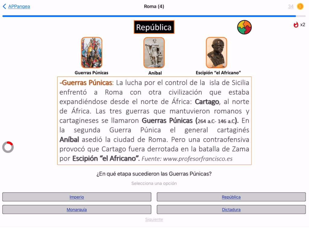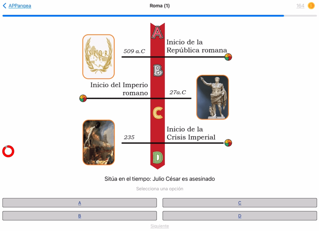 Ordenar cronológicamente: El juego tiene varias preguntas al estilo Timeline: ejes cronológicos en el que hay que ubicar hechos. Esos hechos se pueden consultar previamente en el modo Descubre de APPangea. Al principio el alumno se familiariza con las tres etapas del ROMA: Monarquía, República e Imperio. Poco a poco se va profundizando en hechos concretos y su localización temporal.