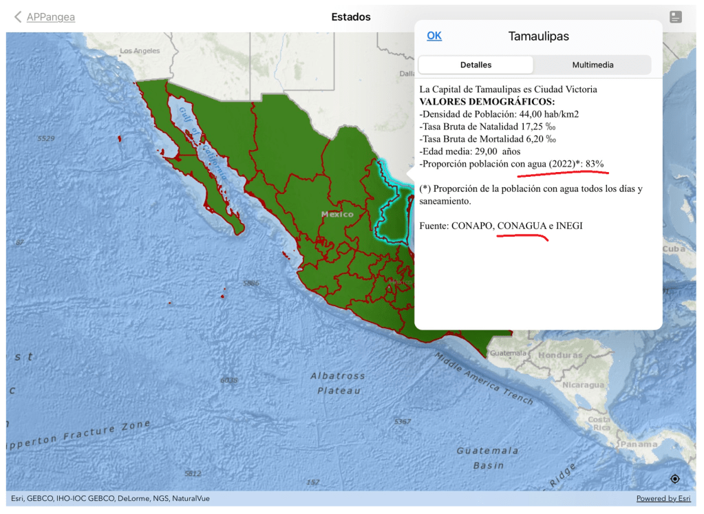 En el modo Descubre de APPangea hemos incorporados datos nuevos. En este caso ha sido en el modo Descubre de Estados de México. A los valores demográficos de cada estado: densidad de población, tasa bruta de natalidad,… hemos añadido la proporción de la población con agua todos los días y saneamiento (CONAGUA).