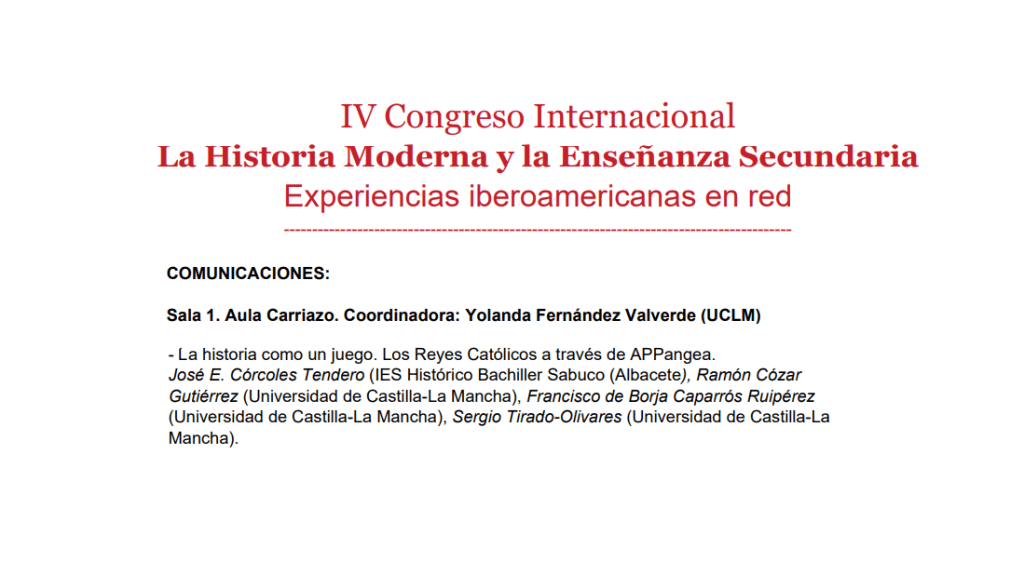 «La historia como un juego. Los Reyes Católicos a través de APPangea» en el IV Congreso Internacional: La Historia Moderna y la Enseñanza Secundaria. Sevilla (20-22 octubre 2022).