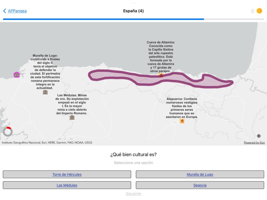 Preguntas sobre localización: Las preguntas de localización, que son la esencia de APPangea, no puede faltar en esta unidad de Patrimonio. Por lo tanto, una vez descubiertas las característica de cada bien, ponemos a prueba a los alumnos sobre dónde está cada uno.
