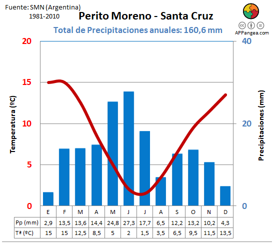 Climograma de Perito Moreno (Santa Cruz) con datos.