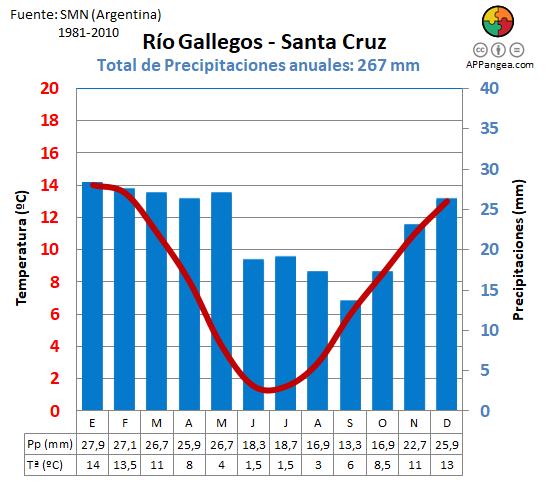 Climograma de Río Gallegos (Santa Cruz) con datos.