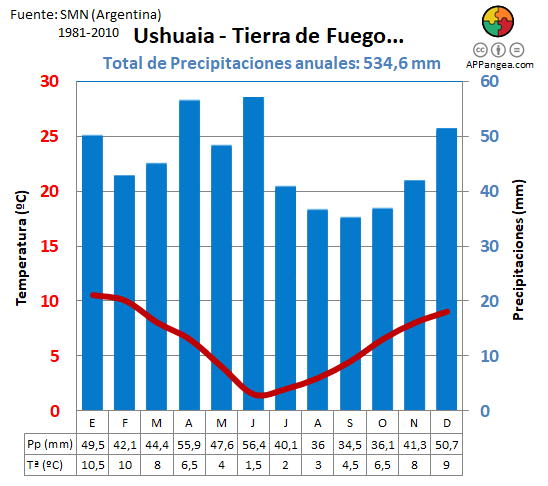 Climograma de Ushuaia (Tierra de Fuego…) con datos.