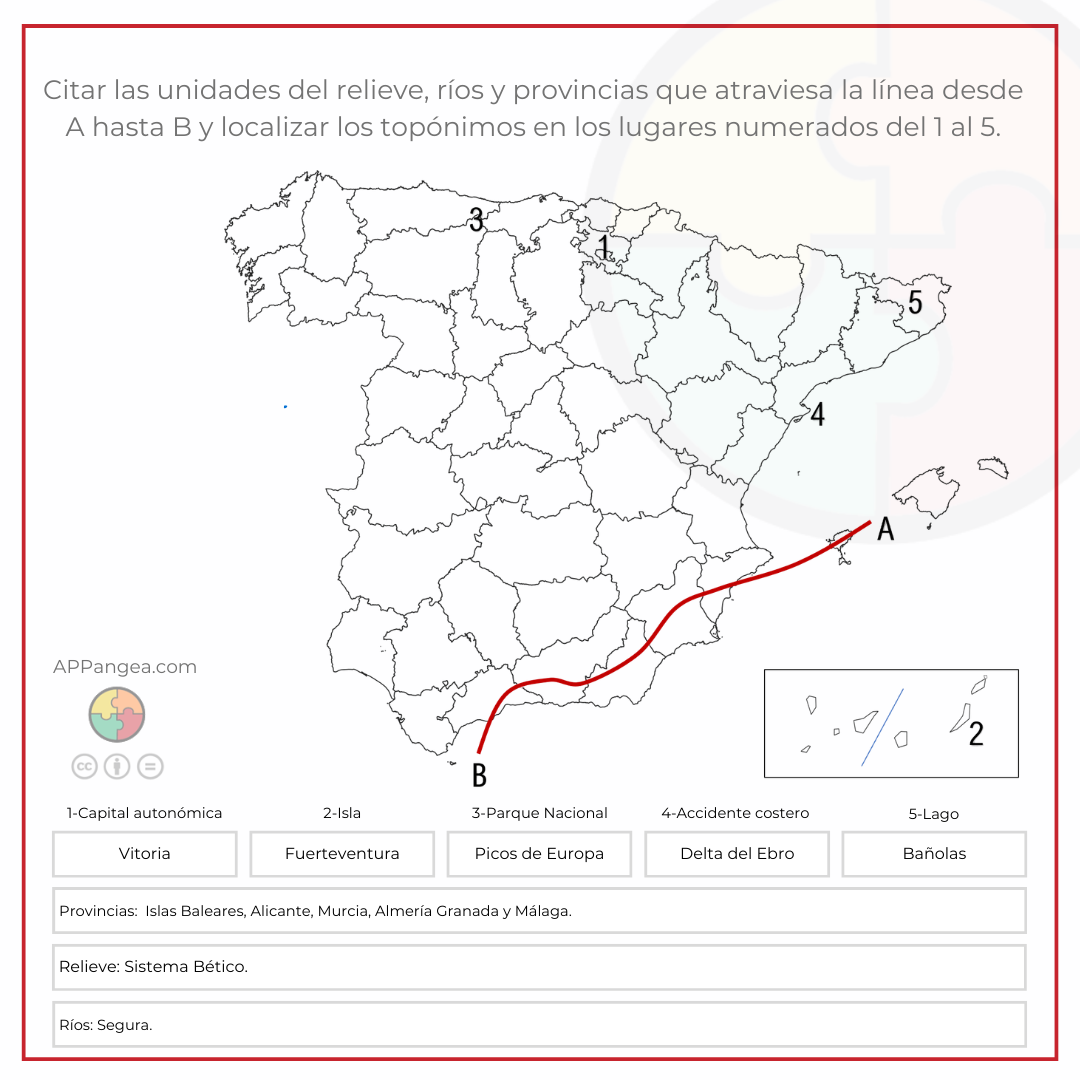 Ejercicio 1: localización de relieve, ríos, provincias, isla, capital autonómica, accidente costero, humedal, embalse o lago, y parque nacional.