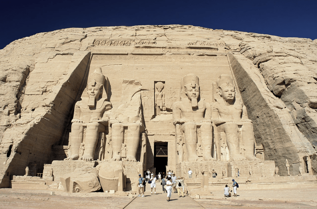 - Abu Simbel: Un templo excavado directamente en la montaña por Ramsés II. Sus estatuas son tan grandes que asustaban a cualquiera que viniera del sur. Cuando se construyó la presa de Asuán, este templo se movió a su lugar actual para no quedar sumergido en el lago Nasser.