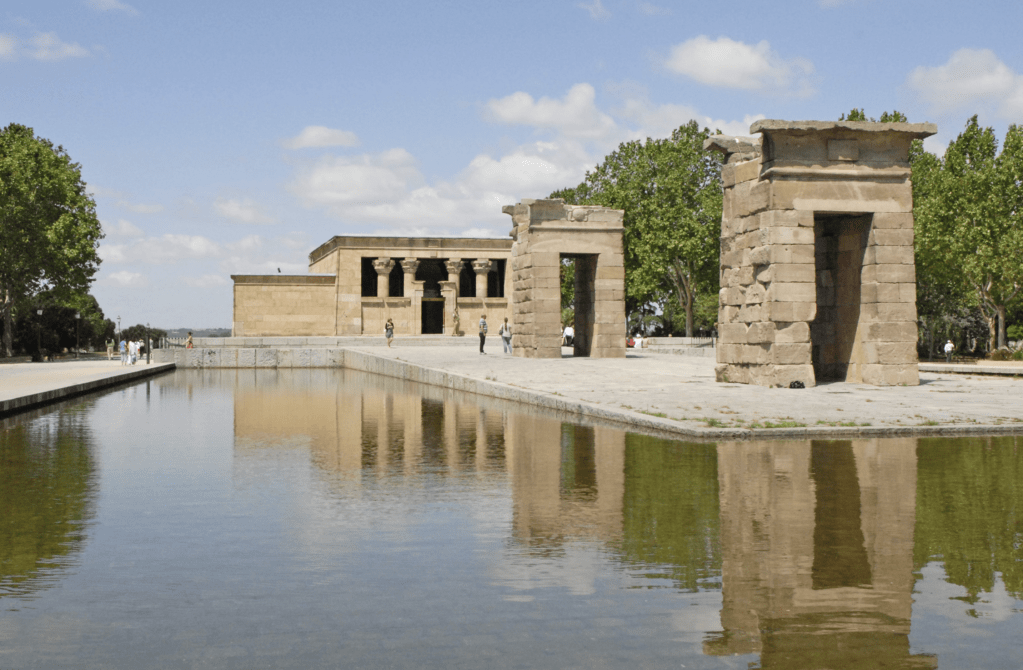 - Templo de Debod: Curiosamente, este templo en Madrid. Egipto se lo regaló a España por ayudar a salvar sus monumentos cuando construyeron la presa de Asuán.