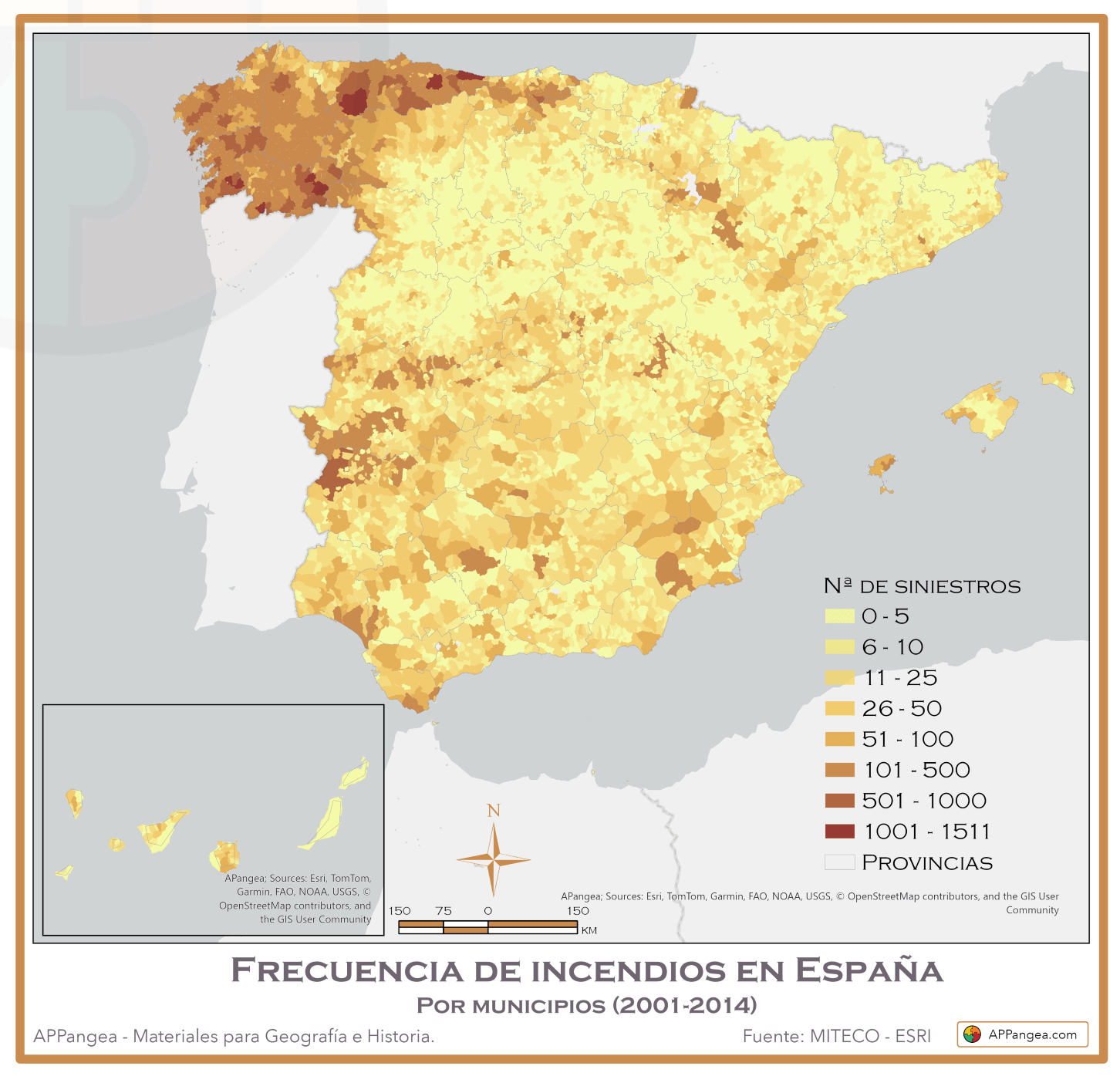 Observa el mapa de «Frecuencia de Incendios». ¿Qué provincias o comunidades autónomas presentan los colores más oscuros (mayor número de siniestros)? ¿Coincide esta zona con las áreas que tienen mayor aridez en el segundo mapa?