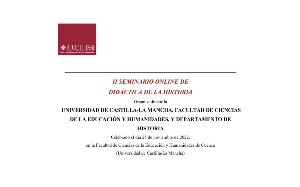 II Seminario Online de Didáctica de la Historia. Universidad de Castilla-La Mancha, Facultad de Ciencias de la Educación y Humanidades, y Departamento de Historia. Cuenca. Noviembre, 2022.